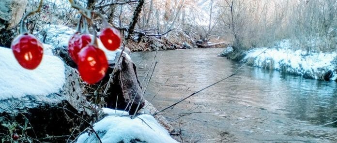 Often, the current takes you through small channeled portages that lead you in view of the translucent leftover chokecherries from a more bounteous season, frozen and still waiting to drop its propagating, life sustaining elegance to the dispensing torrent.
