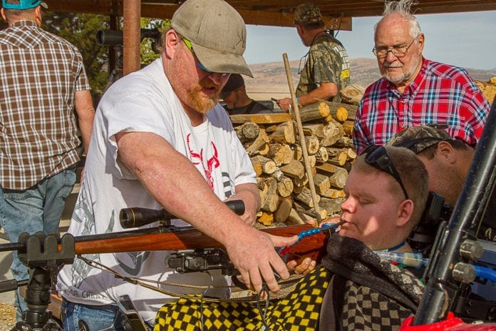 On the morning of the hunt, Kyle was accompanied by his dad Gary Sorenson and nurse Mario. Tony Thurber provided a 4 seat ATV and Todd Branin provided a “puff trigger device” to fire the rifle. This is a device that attaches by a Velcro strap to the rifle and electrically pulls the trigger activated by Kyle sucking on a tube (despite the fact the device is called a puff trigger). It took a while to get everything set up with the triggering device which is battery powered. After everything was rigged up Kyle and Jason did some impressive target practicing. Then it was off in a small convoy of ATVs to venture up the mountain looking for ram sheep.