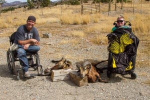 Kyle is a 22-year-old quadriplegic, paralyzed below the neck from a car accident that occurred 3 days before his 8th birthday. He uses a ventilator and speaks well with a good memory. His cousin Jason Peel has been an active hunter despite a work injury that left him a paraplegic for the past 18 years since the accident. Having participated with many outdoor adventures with the Chairbound Sportsman organization Jason wanted Kyle to experience a hunt. Arrangements were made for a ram sheep hunt on the ranch property of Dave Shepard near Levan, Utah. This was Jason’s first time to hunt for ram sheep.