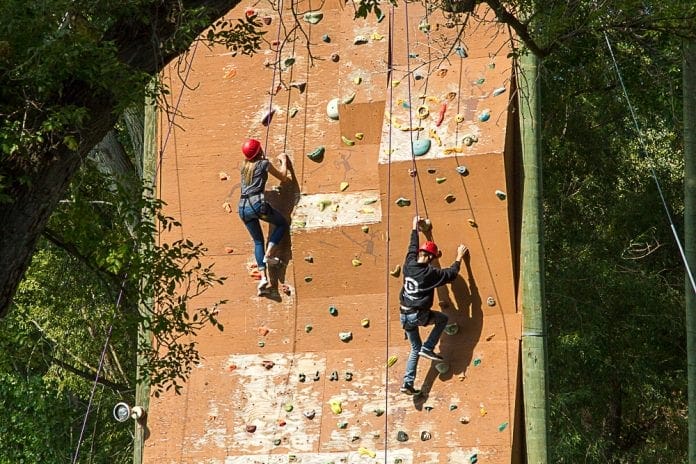 The favorite challenge is the 40-foot climbing wall. This wall has hand and footholds up the face at intermittent distances. The participant wears a harness and climbs the face of the wall. When they get to the top, they let go and are lowered to the ground.