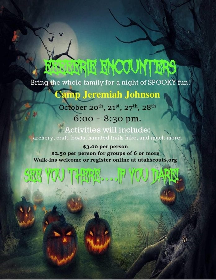 Looking for some spooky fun but not wanting to have nightmares? Camp Jeremiah Johnson in Hobble Creek Canyon is hosting Eerie Encounters October 20 through 28. This is a fun activity for the whole family. Parents and youth can enjoy a haunted trail hike, boats, archery, crafts, spooky story and much more. Just scary enough to leave you wanting more.