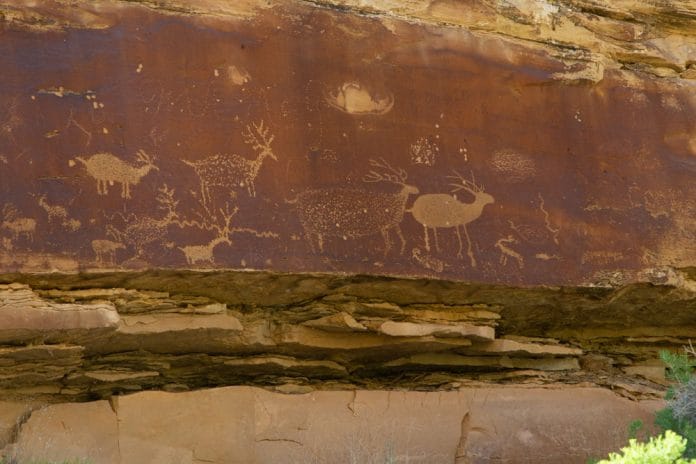 The town ofrGreen River came about because of the railroad and was a source ofrtransportation for cattle and agricultural products. Huge tracts of farm landrlie north of the town thanks to water from the Green River. The area isrparticularly noted for its watermelons. You can see some of this wonderful farmrland if you turn north on Hastings Road on the east end of Main Street. Aboutrten miles north on Hastings Road is a neat white sand beach, known as Swasey’srBeach, that is popular with the local people for picnicking and swimming,ralthough you must be careful of the treacherous river currents. In the cottonrwood trees beyond the beach is a wonderful small campground with vault toilets.rNo reservations, it’s first come availability basis and for some thisrcampground will be a nice change from the commercial RV campgrounds along MainrStreet. Continuing up the river from the campground about 8 miles will find arnice pictograph panel on a ledge on the east side of the road.