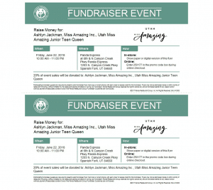 Panda Express at 1203 N. Canyon Creek Parkway in Spanish Fork will be holding a similar event on June 22. Twenty-percent of their sales, with a flyer for Ashlyn, will be donated to Ashlyn that day. You can show a paper or digital version of the flyer.