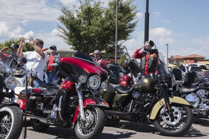 “We contacted Legends about having it there,” Oldroyd said. The spacious paved parking lot in front of Legends Motorcycles was filled by mid-morning with leather-clad motorcyclists and their bikes, which kept increasing in number as the clock tick-tocked to the 2 p.m. presentation of The Colors – achieved with military precision – and opening remarks.