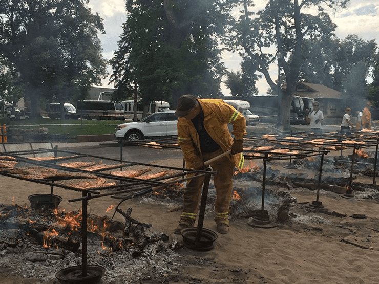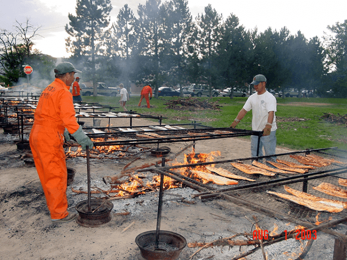 Fire pits are started at noon, so coals get “good and hot,” Janeen Dean told Serve Daily. Dean is the City of Payson’s events coordinator. The town’s volunteer firefighters grill huge chunks salmon over Applewood coals. The only addition: a bit of salt.
