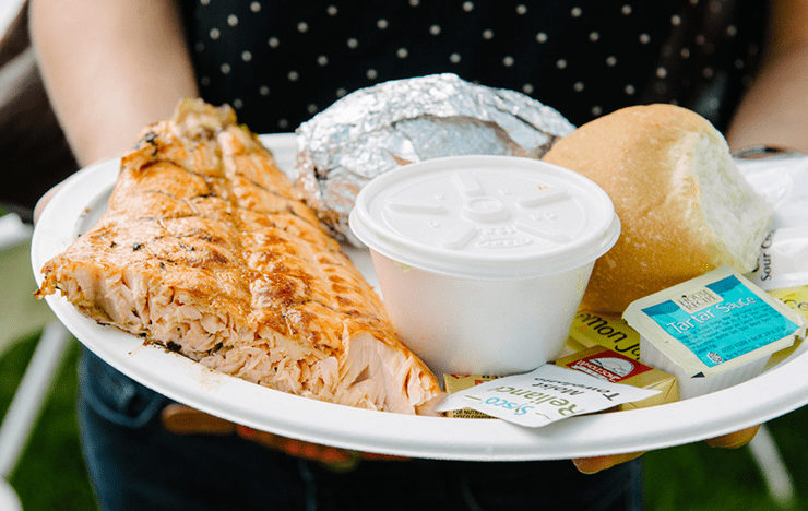 A dinner includes a baked potato, corn on the cob, cole slaw, roll and cookie in addition to Alaskan farm-raised salmon “grilled over dried fruitwood fires,” according to a poster promoting the event. Cost: $16/person.