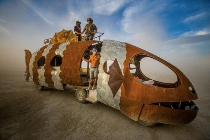 Appearing for the first time at Burning Man in the deserts of Nevada, this forty-five foot monstrosity, nicknamed “The Fish,” is the artistic brainchild of a Park City friend of Rhatigan’s named Zafod.
